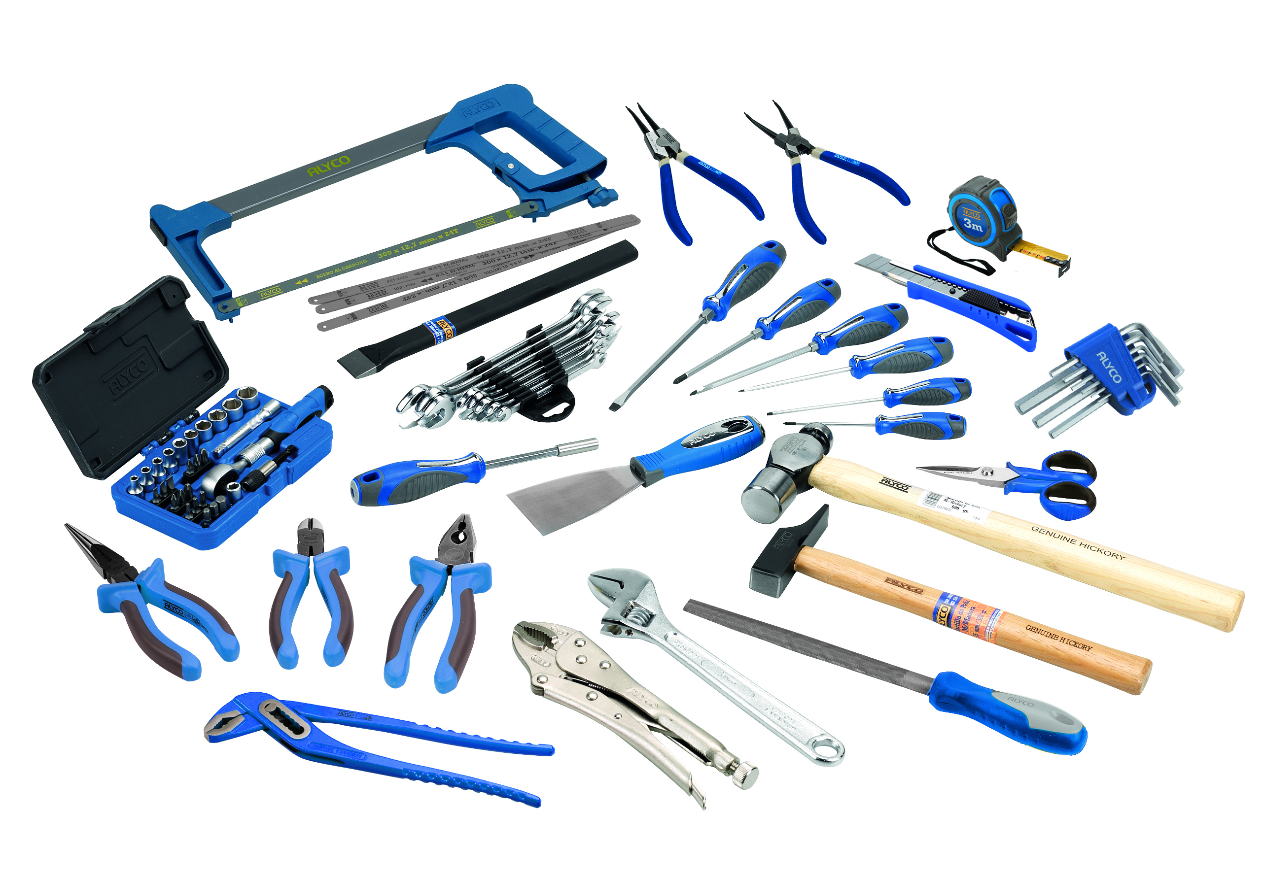Juego de llaves de vaso de 1/4" de 29 piezas, juego de 8 llaves de apriete de doble boca, juego de 9 llaves allen de bola, 3 alicates, 1 alicate pico de loro, 2 alicates seeger, 6 destornilladores, 1 mango portapuntas, 1 llave ajustable, 1 tenaza grip, 1 arco de sierra, 1 tijera de electricista, 1 cortafríos, 1 flexómetro, 1 martillo de bola, 1 martillo de peña, 1 cutter, 1 espatula, 1 lima, 1 hojas de sierra.