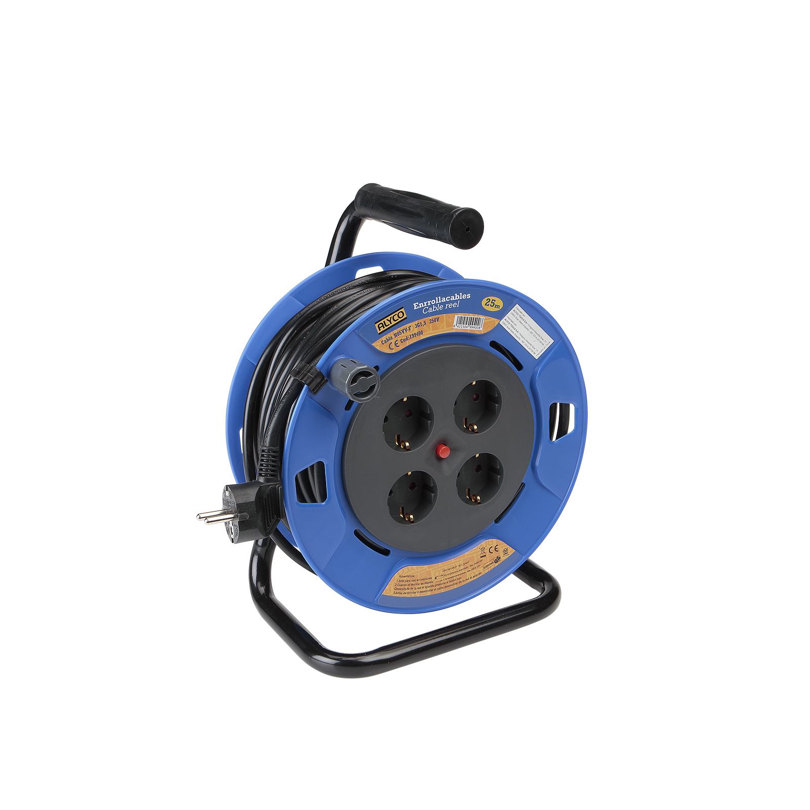 - Enrolador de cabo elétrico com cabo de 3 x 1,5 mm2, IP40, marcações CE e GS. Comprimento do cabo de 25 ou 50 metros.