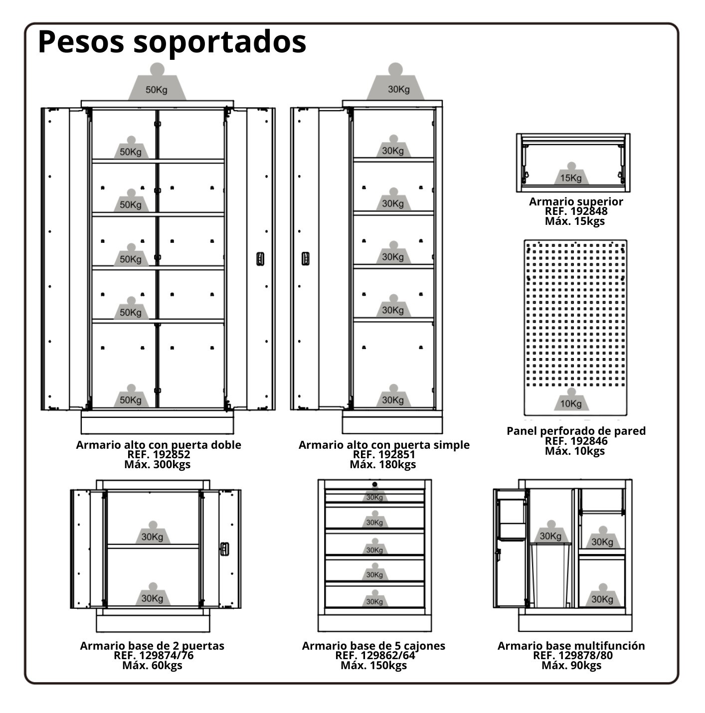 Armoire pour la partie supérieure d'un atelier pouvant être couplée à un panneau et à des piliers pré-percés, avec une structure métallique en tôle d'acier de 0,8 mm et une structure métallique de 1 mm.